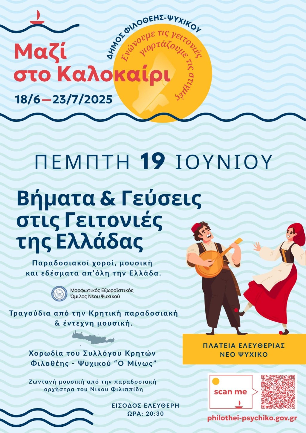 Την Πέμπτη 19 Ιουνίου, στην Πλατεία Ελευθερίας στο Νέο Ψυχικό, ο Μορφωτικός Εξωραϊστικός Όμιλος Νέου Ψυχικού (Μ.Ε.Ο.) και η Χορωδία του Συλλόγου Κρητών Φιλοθέης-Ψυχικού «Ο Μίνως» ένωσαν τις δυνάμεις τους, στο πλαίσιο του φεστιβάλ «Μαζί στο Καλοκαίρι» του Δήμου Φιλοθέης – Ψυχικού και χάρισαν μια μαγική βραδιά με παραδοσιακούς χορούς, μουσικές και γεύσεις από κάθε γωνιά της Ελλάδας!
